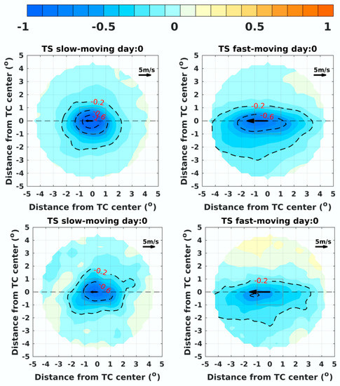 We further explored the influence of TC translation speed on surface salinity response. Slow-moving TCs could increase the amount of TC-related daily accumulated rainfall and consequently result in stronger freshwater flux (Supplementary Figure S5). In addition, slow-moving TCs also tend to input more momentum flux into the ocean, leading to enhanced vertical mixing and SST cooling [65,66]. The composites of SSS response to tropical storms on day 0 in two groups of translation speed (see Method) are shown in Figure 11. The mean translation speed of slower and faster cases is 2.48 m s−1 and 7.80 m s−1, respectively.