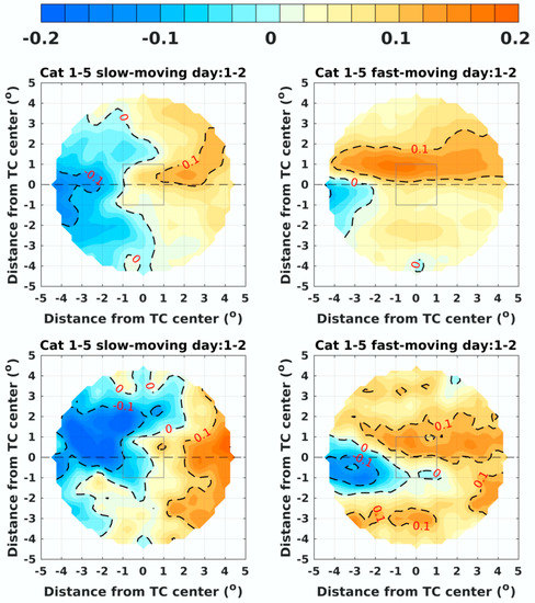 Distribution of SSS response (psu) to Category 1–5 TCs on days 1–2 in the Northern Hemisphere based on translation speed, with SMAP (upper panels) and SMOS (lower panels) swath daily data. Same time period from March 2015 to December 2019 is used for both SMAP and SMOS satellite data. The mean translation speed is 2.67 and 7.44 m s−1, respectively.