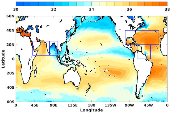 - Boyer, T.P.; Levitus, S. Harmonic analysis of climatological sea surface salinity. J. Geophys. Res. Ocean. 2002, 107, SRF 7-1–SRF 7-14. [Google Scholar] [CrossRef]