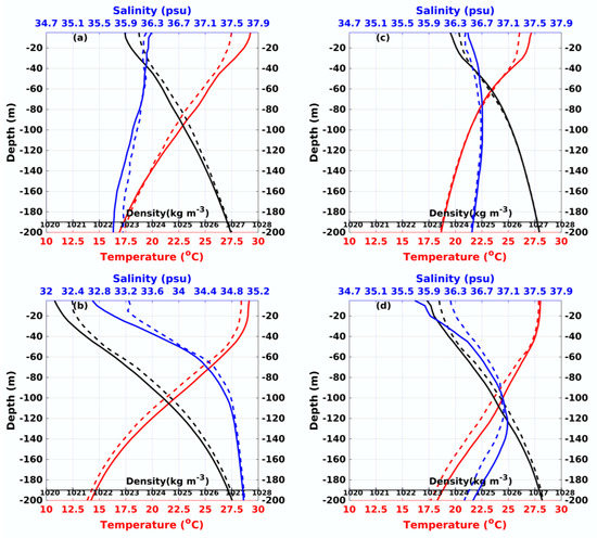 Composite temperature, salinity and density profiles during the reference time period (solid line) and averaged 1–5 days after the passage of the TCs (dashed line) for all storms averaged within the centered 2° × 2° box during 2002 to 2019 in the (a) AS, (b) BoB, (c) SNA and (d) AOP, with in-situ data from Argo floats.