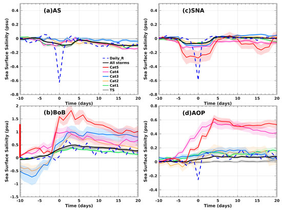 The composite evolution of SSS anomalies for each of the four basins are presented in Figure 15. To obtain more samples, both Aquarius and SMAP satellite data are used (Figure 15). The SSS response time series for these four basins calculated with SMOS satellite data (Supplementary Figure S7) shows similar features. The SSS anomaly calculated with satellite swath daily data exhibits great surface freshening on day 0 in both AS and SNA but much smaller freshening in the AOP. The initial surface freshening due to precipitation is not obvious during the passage of TCs in the BoB. As the SSS under high surface wind is removed from the swath daily data, the surface response on day 0 to intense TCs may not be well displayed. Because of the small sample size in each basin, the Aquarius and SMAP seven-/eight-day running mean data (Figure 15) and SMOS ten-day running mean data (Supplementary Figure S7) are applied to investigate the SSS response to different intensity categories after TCs overpass. It is found that the TC-induced mixing produces a weaker positive response even for intense TCs due to weaker salinity stratification in the SNA. The composite SSS response after TC passage is negative in the AS because of the fresher subsurface salinity (Figure 14), thus TCs in the AS eventually result in a fresher surface. In contrast, TCs in the BoB lead to strong surface salinification. Note that the y-axis of Figure 15b is modified to −1.5 to 2 psu (−1.5 to 3 psu in Supplementary Figure S7b). The mean salinification reaches the maximum on day 2 with the positive SSS response exceeding 0.5 psu, 10 times of the global mean SSS response on day 2. Relatively intense TCs (Category 3–5) in the BoB caused extremely large surface salinification. The amplitude of the positive SSS response after the passage of TCs is as high as 1.5 psu for Category 5 TCs, consistent with the dependence of SSS response amplitude to TCs on vertical salinity gradients and storm intensity shown in Reul et al. (their Figure 3c, [46]). The mean salinification after the passage of TCs in AOP is approximately 0.1 psu, two times of the global mean. However, Category 4–5 TCs exhibit much higher surface salinification (~0.6 psu) than the mean salinification in AOP, which is consistent with the case studies mentioned in the introduction. A possible interpretation is that the most intense TCs (Category 4–5) tend to develop after a strong river plume, and we hypothesize that fresher surface results in stronger vertical stratification, reduces the SST cooling, and facilitates the TC intensification.