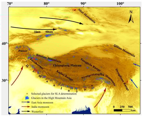 The western and northern regions of High Mountain Asia are affected primarily by the westerlies, whereas the southwest region is affected mainly by the Indian monsoon. The eastern and southeastern regions are influenced mainly by the East Asian monsoon and also by the plateau monsoon caused by the uplift of the Tibetan Plateau [,]. Owing to the impact of different wind systems, High Mountain Asia regional glaciers can be catalogued as continental or marine glaciers in the southwest and continental or polar glaciers in the northwest [,]. Annual precipitation ranges from 600 to 1000 mm in the Altai Mountains to above 3000 mm in the southeast region of High Mountain Asia. Precipitation is the material basis of mass balance and ELA changes. Accordingly, glacier ELAs vary from 2800 m in the Altai Mountains to 6200 m in the Himalayas [].