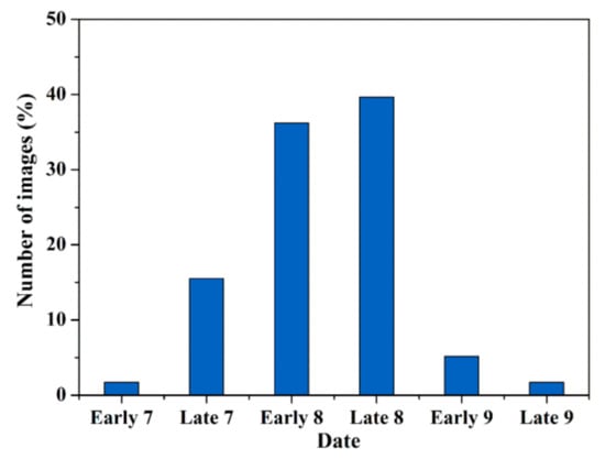 We primarily selected images from the mid/late July–early September timeframe because the glacier SLA at the end of the ablation period should be the maximum SLA for a given year, which means that this SLA can represent the ELA. This image selection process also allowed us to evaluate and reduce the impact of image spatial resolution on glacier SLA. The ablation period mainly occurs in the June–August timeframe, although the highest SLA may be observed in early September if either warmer temperatures persist or there is little/no new precipitation. Approximately 90% of the analyzed Landsat images were acquired in the late July–August timeframe, with 75% acquired in August and 15% acquired in late July (Figure 2).