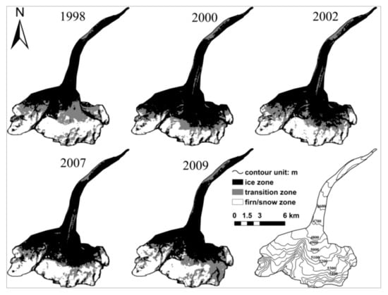 The distribution of bare ice and snow-covered areas based on appreciably different albedo on the Shamshar gang glacier in Western Himalayan in 1998, 2000, 2002, 2007, and 2009 [].