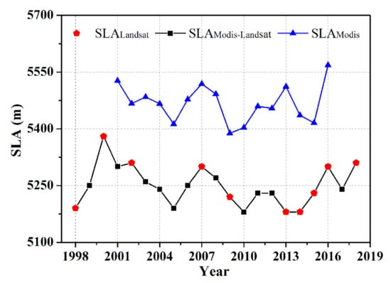 There are fewer available Landsat scenes for assessing the glacier SLA uncertainty over different dates in a given period due to the temporal resolution of the Landsat images and the impacts of clouds and new snowfall. We therefore combined the Sentinel-2 data, which possess a high temporal resolution (five days when using the data from 2A and 2B). Similarly, the Landsat temporal resolution, cloud cover, fresh snowfall, and stripe of the Landsat ETM data, all of which may result in missing data, could affect the glacier SLA time series reconstruction and analysis of glacier SLA variability over time. In particular, the glacier SLA in a given single year may determine the linear trend of the entire SLA, making it critical to have a complete SLA time series. MODIS data have a high temporal resolution (1 day) and long time series (data acquisition since 2000), but they possess a low spatial resolution (≤500 m); we therefore used the Landsat-derived SLAs as the “true values” to correct the MODIS-derived SLAs and further interpolate the Landsat-derived SLA time series (Figure 4).