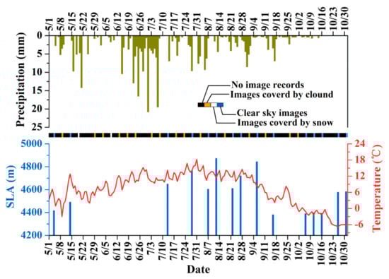 Sentinel-2 images (1 May–31 October 2018 timeframe) were also used to further evaluate the influence of the temporal resolution of the sensor on glacier SLA (Figure 5). The relationship between glacier SLA and temperature/precipitation during the ablation season was analyzed using the Sentinel-2 images, and temperature and precipitation observations from Tuole weather station, which is near Qiyi Glacier (Figure 5). We extracted the glacier SLA from 15 images during the ablation season due to the influences of new snowfall, cloud cover, and the temporal resolution of the satellite images. The glacier SLA was above 4600 m from July 28 to September 6, with a maximum SLA of 4873 m observed on August 12. The results indicated that the average variability from the highest SLA (August 12) during the late July–August timeframe was 132 m, with minimum and maximum variations of 29 and 268 m, respectively. These Sentinel-2-derived glacier SLA data suggest that our analysis of the Landsat scenes that were mainly acquired in August to extract glacier SLA could extract the highest glacier SLA. A comparison and analysis of our extracted glacier SLA positions with temperature and precipitation data revealed that the extracted SLAs from the late July–early September timeframe were high due to higher temperatures and less precipitation during this period. The highest SLA does not appear around July 31, when the temperature is highest, because there is more precipitation at the end of July. The highest SLA, which was acquired on August 12, was due to relatively high temperatures and less precipitation in the middle of August. Our correlation coefficient statistics indicate that glacier SLA is positively correlated with temperature (r = 0.56), which suggests that glacier SLA is mainly influenced by temperature. Temperature, precipitation, and SLA all show downward linear trends, which also indicates that temperature is the main factor influencing the observed glacier SLA variations.