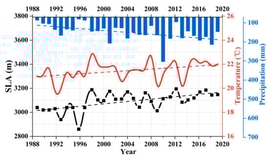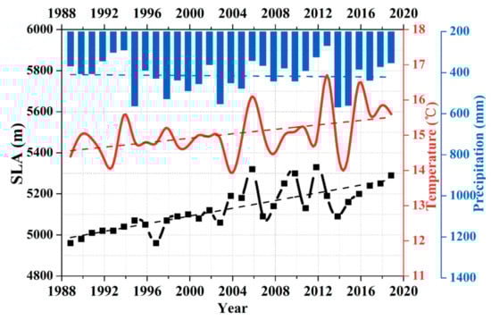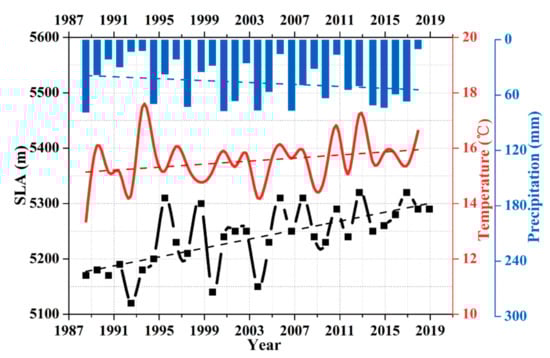 The mean SLA across the Karakoram Mountains at the end of the melt season (generally August) during the 1989–2019 period is shown in Figure 9. There is an obvious increase in mean glacier SLA over time, with a maximum increase from 5120 ± 159 m in 1993 to 5320 ± 240 m in 2013, which indicates that these glaciers were in a state of mass loss during the analysis period. Linear regression analysis of the SLA time series revealed a 123-m increase in mean SLA across this region during the 1989–2019 period.