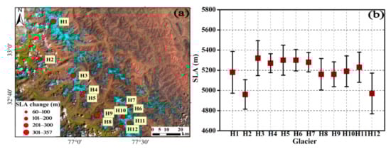 (a) SLA changes and (b) mean SLA of the nine analyzed glaciers across the Karakoram Mountains during the 1989–2019 period. The error bars in (b) represent one standard deviation from the mean.