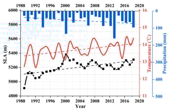 We calculated the precipitation and mean temperature from the June–August (summer) observations at Tashkurgan weather station since the Karakoram Mountains experience both summer accumulation and ablation (Figure 9). The summer precipitation and temperature in the Karakoram Mountains both exhibited increasing trends over the study period. Temperature may therefore contribute to the increase in glacier SLA. The mean SLA across the Karakoram Mountains during the 1989–2019 period exhibited a strong positive correlation with summer mean temperature. The lowest SLA was observed in 1993, followed by an SLA of 5140 ± 171 m in 2000. The lowest summer mean temperature occurred in 1989. However, the difference in SLA between 2000 and 2004 was only 20 m, which was within the uncertainties of the SLA derivation. The highest glacier SLA was observed in 2013, when the mean summer mean temperature was 17.23 °C and there was relatively little precipitation (~50 mm). The correlation coefficients between mean glacier SLA and the summer mean temperature and summer precipitation in the Karakoram Mountains were 0.41 and 0.03, respectively. The mean SLA across the Karakoram Mountains during the 1989–2019 period exhibited an obvious positive correlation with summer mean temperature. The linear trends in summer mean temperature and mean SLA further suggest that temperature is the primary factor influencing the observed glacier SLA changes across the Karakoram Mountains.