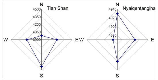 Glacier SLA in different orientations in the Tian Shan and the Nyainqentanglha Mountains.