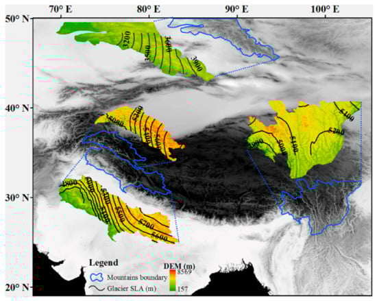 The mean SLA across the Altai Mountains, Karakoram Mountains, Western Himalayas, and Gongga Mountains increased during the 1989–2019 period. The mean glacier SLA across the Altai Mountains ranged from 2860 ± 169 m to 3200 ± 152 m, and the mean glacier SLA across the Karakoram Mountains varied from 5120 ± 159 m in 1993 to 5320 ± 240 m in 2013, with the glaciers across both regions experiencing an average SLA increase of 123–151 m over the past 30 years. The mean glacier SLA across the Western Himalayas and Gongga Mountains increased by 190–282 m over the past 30 years, with the mean SLA across the Western Himalayas ranging from 4910 ± 190 m in 1989 to 5380 ± 164 m in 2000, and that across the Gongga Mountains increasing from 4960 ± 70 m to 5330 ± 100 m. The was a general increase in glacier SLA from the Altai Mountains to the Karakoram Mountains, with a decrease in glacier SLA with decreasing latitude across the Himalayas; the maximum SLA occurred near the northern slopes of the Western Himalayas. The glacier SLAs were in the 3100–3800, 5000–5800, 5800–4700, and 4900–5200 m ranges across the Altai Mountains, Karakoram Mountains, Western Himalayas, and Hengduan Mountains, respectively. Correlation analyses between glacier SLA and temperature/precipitation suggested that the mean glacier SLAs in the study areas were mainly influenced by temperature. Furthermore, the glacier SLA in the westerlies (Tian Shan) and monsoon control zones (Nyainqentanglha Mountains) are affected by both temperature and precipitation. However, temperature appears to generally play a more important role than precipitation.