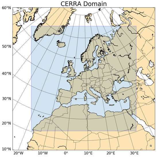 The domain of the Copernicus European Regional Reanalysis (CERRA) system represented by the highlighted region in blue shading.