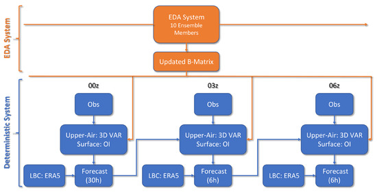 A summary of the coupled Ensemble Data Assimilation (EDA) and deterministic system represented by the orange and blue colour shading, respectively. The B-Matrix is updated using the forecast differences from the 10 ensemble members. The three-dimensional variational (3D-VAR) from the deterministic system uses the updated B-Matrix to assimilate recent observations and compute the analysis. The forecasts are initialized using the analyses and integrated in time using the LBCs, while the 3-h forecasts are used as the first guess or background for the assimilation in the following cycle.