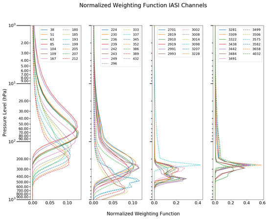 The satellite instrument and channel selections in the assimilation of radiances were adopted from the HARMONIE system [17], shown in Table 3. They span from the early 1980s to near real-time, providing an adequate satellite coverage throughout the majority of the CERRA reanalysis. The satellite instruments include Microwave Sounding Unit (MSU), Advanced Microwave Sounding Unit-A/B (AMSU-A/B), Microwave Humidity Sounder (MHS) and Infrared Atmospheric Sounding Interferometer (IASI). In addition, the normalized weighting functions of all assimilated IASI channels are shown in Figure 3.