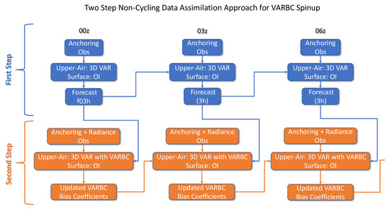 A workflow diagram of the two-step data assimilation approach used to spin up the VARBC coefficients in the CERRA system.