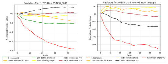 As defined by [38], the radiance observation bias is represented by the linear regression from a set of predictors , weighted by unknown bias predictor coefficients . Then the bias can be implemented into the observation operator defined by Equation (3):