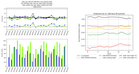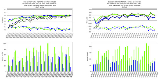 The VARBC coefficients were effectively spun up by adopting the two-step data assimilation approach. Figure 5 (left) illustrates the progression of the bias correction predictor coefficients during the 47-day VARBC spin up period for IASI channel 239 (704.50 cm) on MetOp-B at the 09 UTC cycle. This plot shows that the bias correction coefficients for most of the predictors have converged to stable values after approximately 43 days. In addition, Figure 6 (top-left) shows the evolution of the bias correction for the same channel over land and sea. The result reveals that observation minus first-guess (OMF) and observation minus analysis (OMA) biases slowly decrease towards 0 K from −0.43 and −0.2 K, respectively. After 43 days, the OMF and OMA biases have reduced to near-zero, which is consistent with the convergence of the bias correction predictor coefficients seen in Figure 5 (left). On the other hand, the non-corrected bias of OMF maintained approximately the same values, as expected. Similar results in Figure 5 (right) show the convergence of bias correction predictor coefficients for AMSU-A channel 6 (GHz) on MetOp-A after 15 days. Furthermore, the bias comparison in Figure 6 (top-right) indicates the OMF and OMA are reduced below 0.1K with the same period from −0.5 and −0.3 K, respectively. Overall, the two-step data assimilation procedure for the VARBC coefficients spin-up has been demonstrated to be effective in stabilizing the gradual reduction of the biases from the radiance observations and iteratively refining the bias coefficients during the spin-up period. Comparable results were found for the other IASI, AMSU-A, and AMSU-B/MHS channels.