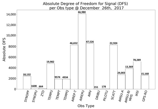 The absolute DFS computed from all assimilation times on 26 December 2017. All observations that are assimilated in the CERRA system were examined, including geopotential height (SYNOP Z) and wind components (SYNOP U) measurements from land surface stations; drift buoys (DRIBU); wind components (TEMP U), temperature (TEMP T) and specific humidity (TEMP Q) measurements from radiosonde; wind components (AIREP U) and temperature (AIREP T) measurements from aircraft observations; wind components from pilots or PIREP (PILOT U); zenith total delay (ZTD); GNSS Radio-Occultation (GPS-RO); Atmospheric Motion Vector (AMV); Scattometer (SCATT); Advance Microwave Sounding Unit-A (AMSU-A), Advanced Microwave Sounding Unit-B and Microwave Humidity Sounder (AMSU-B); and Infrared Atmospheric Sounding Interferometer (IASI). The numerical values above the bar plots represent the number of each observation type.