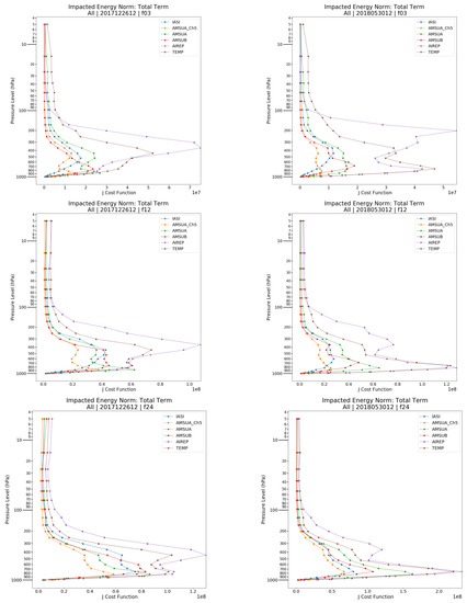 One can infer the sensitivity of the forecast model from a subset of observations by examining the loss of moist total energy norm when removing them from the assimilation system [20]. Essentially, the MTEN can be expressed as a cost function J, which is computed through a comparison between the control forecast that was initialized with the assimilation of all observations versus the forecast that was initialized without the assimilation of the subset of observations, as shown in Equation (7). The forecast time is defined by t, while i represents the index of the observations subset to be removed and studied. Also, a localization operator P can be used to examine the sensitivity of the forecast model within a specific subset of the model domain, such as between particular model levels, spatial regions, and/or sea/land masks [41,44].