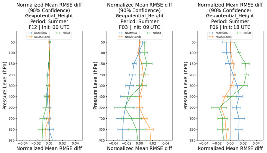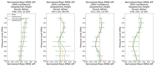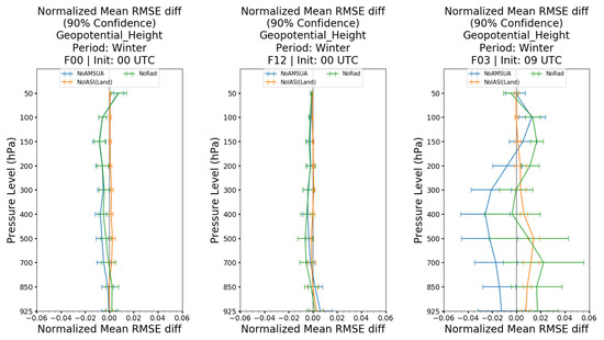 The vertical profile of the normalized by the mean scores, Root Mean Square Error (RMSE) difference at 90% confidence for the geopotential height (in meter) between the control experiment (“AllSat”) and the individual experiments (“NoAMSUA” (blue), “NoIASI(Land)” (orange) or “NoRad” (green)). The AllSat experiment assimilates all observations; the “NoAMSUA” experiment assimilates all observations, except for AMSU-A; “NoIASI(Land)” experiment assimilates all observations, except for IASI observations over land; “NoRad” does not assimilate any radiance observations. The computed statistics are valid for the winter case, spanning from 23 December 2017 to 16 January 2018. Each subplot depicts the comparison at a specific analysis (F00) or forecast lengths (F03) that is initialized at a particular assimilation time.