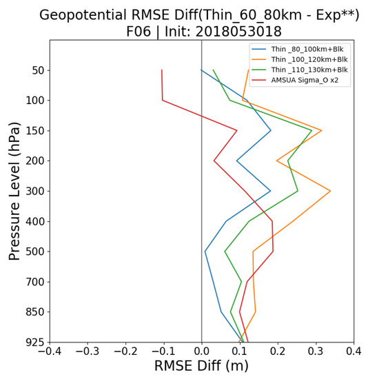 A vertical profile of Root Mean Square Error (RMSE) difference of 6-h forecast geopotential height between the control experiment (Thin_60_80 km) and the four impact experiments. The 6-h geopotential height forecasts, initialized at 18 UTC on 30 May 2018 were verified against radiosonde observations. Table 6 summarizes the configuration of the five experiments that were examined in this comparison.
