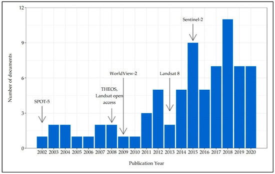 Out of 74 documents reviewed, 58 (78.4%) were peer-reviewed journal articles, 15 (20.3%) were conference papers, and one (1.3%) was a thesis. The earliest publication was in 2002 [49]. Figure 2 shows the distribution of the reviewed documents based on publication year. There were 13 documents published from 2002 to 2010. However, from 2011 onwards, 61 documents were published. This represents a total of 82.4% of the documents identified in this literature review. This is most likely due to the availability of data from recently launched satellites and the Landsat open access policy [50]. The launching of Landsat 8 in 2014 and Sentinel-2 in 2015 may also have played a critical role in the high number of publications recorded in the following years. Overall, the published documents from 2002 to 2020 display an increasing trend.