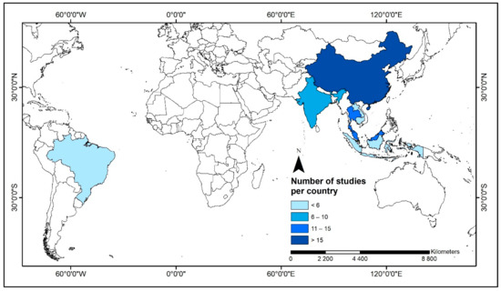 The local scale research was conducted in seven countries. The locations of these studies are presented in Figure 3. Out of 68 studies done at a local scale, more than one-third took place in China, making it the most dominant local scale study location. This may be due to the fact that China is a major rubber producer and the largest consumer of natural rubber [32,52]. This also reflects China’s rapid planting area expansion [53]. It is also noted that most of the other study areas were located in Southeast Asia. Thailand and Malaysia had the highest number of studies at 14 and 13, respectively. Southeast Asia has the largest area planted to rubber and contributes up to 97% of total global natural rubber production [36]. Furthermore, it can be seen that the study areas lie between latitude 30°N to 30°S, which has suitable agro-climatic conditions for rubber cultivation.