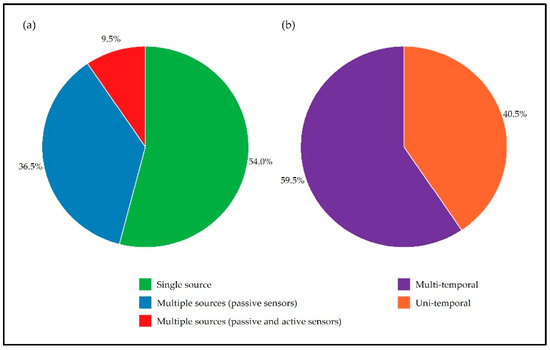 Temporal resolution is an important criterion for multi-temporal studies. In general, a satellite with high revisit time provides the advantage of acquiring cloud-free images for multi-temporal analysis. The highest and lowest temporal resolution used in all 74 documents ranged from 1 day with MODIS [36] to 16 days with Landsat [59]. As shown in Figure 4, 59.5% (44 documents) of the selected documents used multi-temporal scale in their studies. Out of 44 documents, a majority (35 documents) used Landsat. More than 40% (20 out of 44 documents) of these studies were focused on rubber area expansion. These coincide with the rubber boom in the mid-2000s [60,61].
