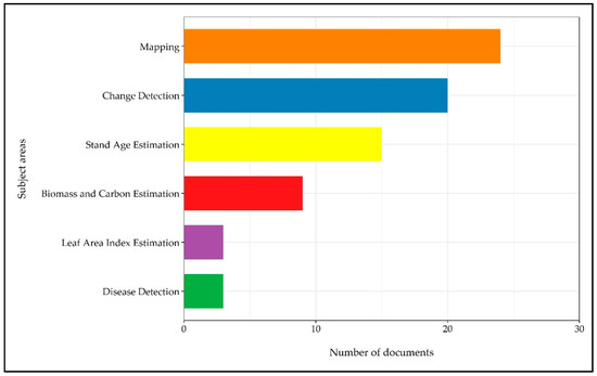 Figure 6 shows the distribution of documents that fall into each subject area. There were 24 documents that focused on rubber plantation mapping. This was followed by plantation area change detection, and stand age, with 20 and 15 studies, respectively. These three subject areas were most likely dominant in the selected studies because they were dependent on basic classifications and methods. The other subject areas were more complex and required additional understanding of the subject matter.