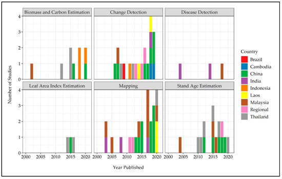 The current application of remote sensing in rubber plantations can be categorised into six subject areas: (1) Mapping; (2) change detection; (3) stand age; (4) biomass and carbon estimation; (5) leaf area index estimation and (6) disease detection. The selected documents were grouped into these subject areas based on the study’s primary objective. When the documents incorporated more than one subject area, it was classified based on the most dominant subject area.
