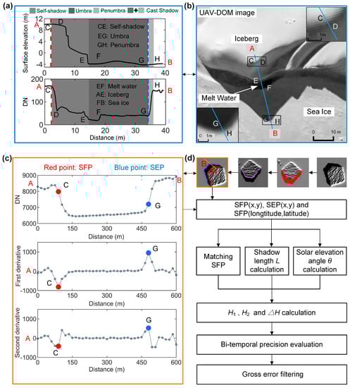 We developed an automatic process to measure the shadow freeboard H. The proposed process has six steps: (1) automatic extraction of the iceberg’s shadow regions, filtering the shadows fully on icebergs and locating initial SFPs (SFP0s); (2) accurate determination of the locations of SFPs and SEPs using the corner features of interpolated DN-profile along the exact shadow direction of SFP0s (Figure 2c); (3) bi-temporal SFPs matching; (4) H1, H2, and calculation; (5) bi-temporal precision evaluation; and (6) gross error filtering. The general framework of the proposed method is shown in Figure 2d.