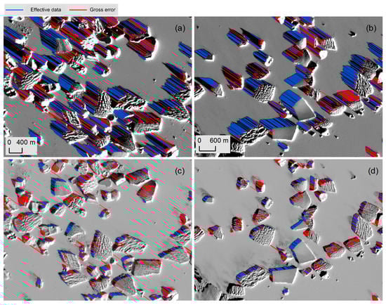 Gross error filtering of H9/30–H8/29. Distribution of the effective shadow vectors (blue lines) and the bad shadow vectors (red lines) overlaid on the images taken on (a,b) 29 August 2016, and (c,d) 30 September 2016.