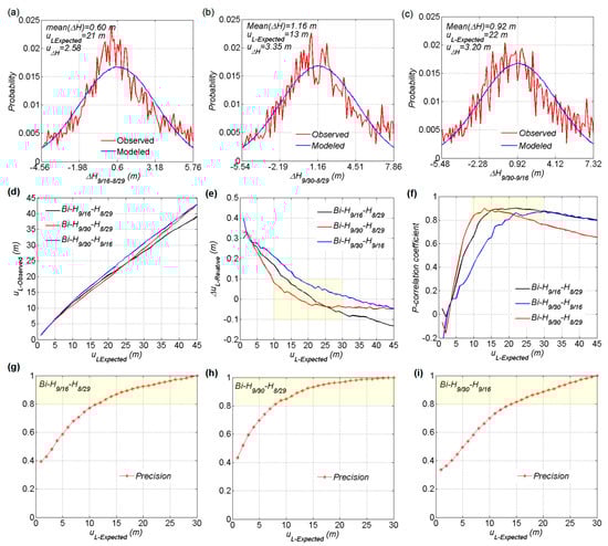 The probability distributions between the observed (a) , (b) , and (c) and a modeled normal distributed with means of and 1-σ of in the interval of at intervals. The variations of the (d) , the (e) absolute , and the (f) P-correlation coefficient with the at 1-m intervals. The precision of the bi-evaluated shadow length precision of the (g) bi-H9/16–H8/29, (h) bi-H9/30–H8/29, and (i) bi-H9/30–H9/16.