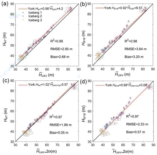 The comparison between the shadow freeboard and UAV freeboard, the (a) H9/7 and , (b) H9/16 and , the (c) H9/7 and , and the (d) H9/16 and . The red lines show the York’s linear fit between the data. The fit considered the estimated precision of the shadow freeboard H9/7 and H9/16, the precision of the UAV freeboard, and the standard deviation of the . The black line is the 1:1 line.