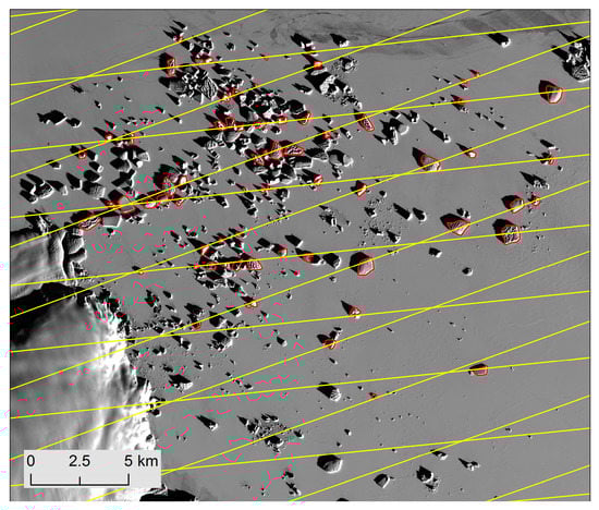 The 76 icebergs (red polygons) tracked by all the ICESat-2 repeated orbits (yellow lines) overlaid on the Landsat-8 image taken on 29 August 2016 in the study area.