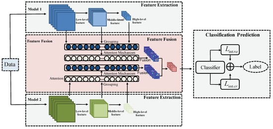 After grouping and attention, the feature maps are added for fusion, according to the rule that the corresponding subgroups from three levels are added together. For instance, is the ith feature map of in the low-level, after the manipulations of grouping and attention. The feature maps of middle-level and high-level are denoted as and , respectively. Then, , , and are fused via summation, producing the fused sub-feature map of the ith subgroup. The fused feature map are generated by the summation of all the 32 sub-feature maps. The final fused feature map of the dual-model architecture is produced by concatenating the feature map F of each single model.