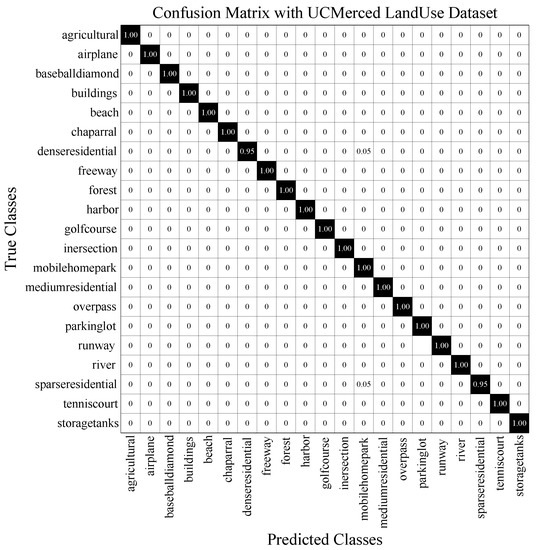To inspect the class-wise performance of our method, confusion matrix (CM) is adopted, as shown in Figure 7. The error occurs when the dense residential is misclassified as the mobile home park and the sparse residential is misclassified as the mobile home park. This illustrates the confusing categories including mobile home park, dense residential, and sparse residential.