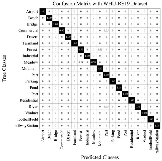 - WHU-RS19 Dataset []: The images of this dataset are collected from Google Earth, containing in total 950 images with the size of . The ground sampling distance is 0.5 m per pixel. There are 19 categories with great variation, such as commercial area, pond, football field, and desert, imposing great difficulty for classification.