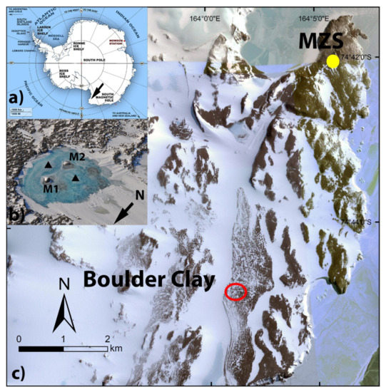 The study site is a perennially frozen lake (74.7466°S, 164.0197°E, 205 m a.s.l.) located in an area called Boulder Clay, close to Mario Zucchelli Station (MZS) in northern Victoria Land (Antarctica) (Figure 1). The lake is a dry-based type and, in summer, melting can occur at its bottom, thus generating saline water [10]. On its surface, two icing blisters are visible (black triangles Figure 1), while two frost blisters (M1 and M2), developed from the basin, cross the ice surface [10] (Figure 1).