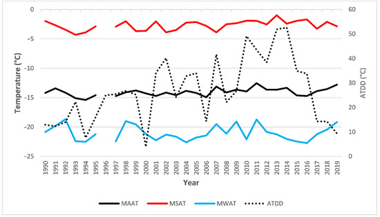 Trends of the principal climatic parameters for the period 1990–2019 at the closer available automatic weather station (AWS) “Eneide” 5 km far from the analyzed lake at Boulder Clay. Legend: MAAT = mean annual air temperature; MSAT = mean summer air temperature (DJF); MWAT = mean winter air temperature (JJA); ATDD = annual thawing degree days.