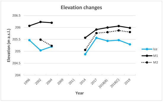 In addition, the lake ice level at the eastern border of the lake (green bar) was constant through the comparisons (except for 2004 when the lake ice was hidden by the snow cover), while its level in correspondence with ice cracks (black bar) near the frost blisters (internal ice level) was higher in 2018 than in all the other reference years (except for 1996) and more pronounced in the 2002–2018 comparison (Figure 2c,d). If we consider the calculated elevations (Table 2), 2014 was the year with the lowest height both for M1 and M2 and for the internal ice. Indeed, conversely to the blisters, the internal ice surface pulsated (rose and subsided) every year since 1996 until 2019. It is also interesting to notice that between 2014 and 2017 the three features underwent a bigger change compared to previous and following years (+34.4, +70.4 and +68.5 cm for M1, M2 and Ice, respectively) but probably this can be related to the change of method (DEM differencing) (Table 2, Figure 4).