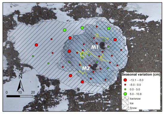 During the whole examined period, the pattern of ice level changes has been even more variable than that of the blisters. This could be explained by the debris cover that can reduce the ice sublimation within the permafrost of the two frost blisters compared to the sublimation on the lake ice or on the snow as known in literature [54]. For example the sublimation measured on the till in the Dry Valleys was around 0.22 mm year−1 [54], while on glacier ice of continental Antarctica was up to 40 cm year−1 [55] and on perennially frozen lake the annual loss of ice ranging between 0.64 and 0.99 m year−1, e.g., Dugan et al. [26].