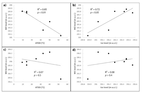 Linear regression between the frost blisters’ elevation change and the ATDD (a,c) and the ice level (b,d). M2 elevation changes are plotted against the ATDD of the previous year (a) and then against the ice level elevation (b). Similarly, M1 elevation changes are plotted against the ATDD of the previous year (c) and then against the ice level elevation (d).