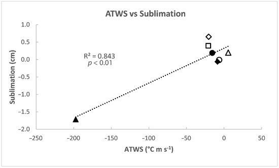 It is well documented that ice sublimation increases when wind speed and air temperature increases, e.g., [26,34,58], but, as demonstrated by Andersen et al., the wind is more effective than air temperature [33] at least in Antarctica. Here, we obtained a statistically significant linear regression between the ice sublimation and the ATWS (Figure 7). Through this regression we calculated the annual sublimation that was very similar (18 cm) to the remotely-sensed measured one (18.1 cm). Hence, at Boulder Clay, winter ice sublimation has a greater impact than summer sublimation (because wind speed is higher on average and air temperature strongly lower) and this is in accordance to Andersen et al. [33]. Moreover, the maintenance of a high winter sublimation could be related to a scarce snow cover of the lake that would protect the ice surface [34,54,60,61], even though the subsurface sublimation of ice/snow is possible, e.g., [61,62].