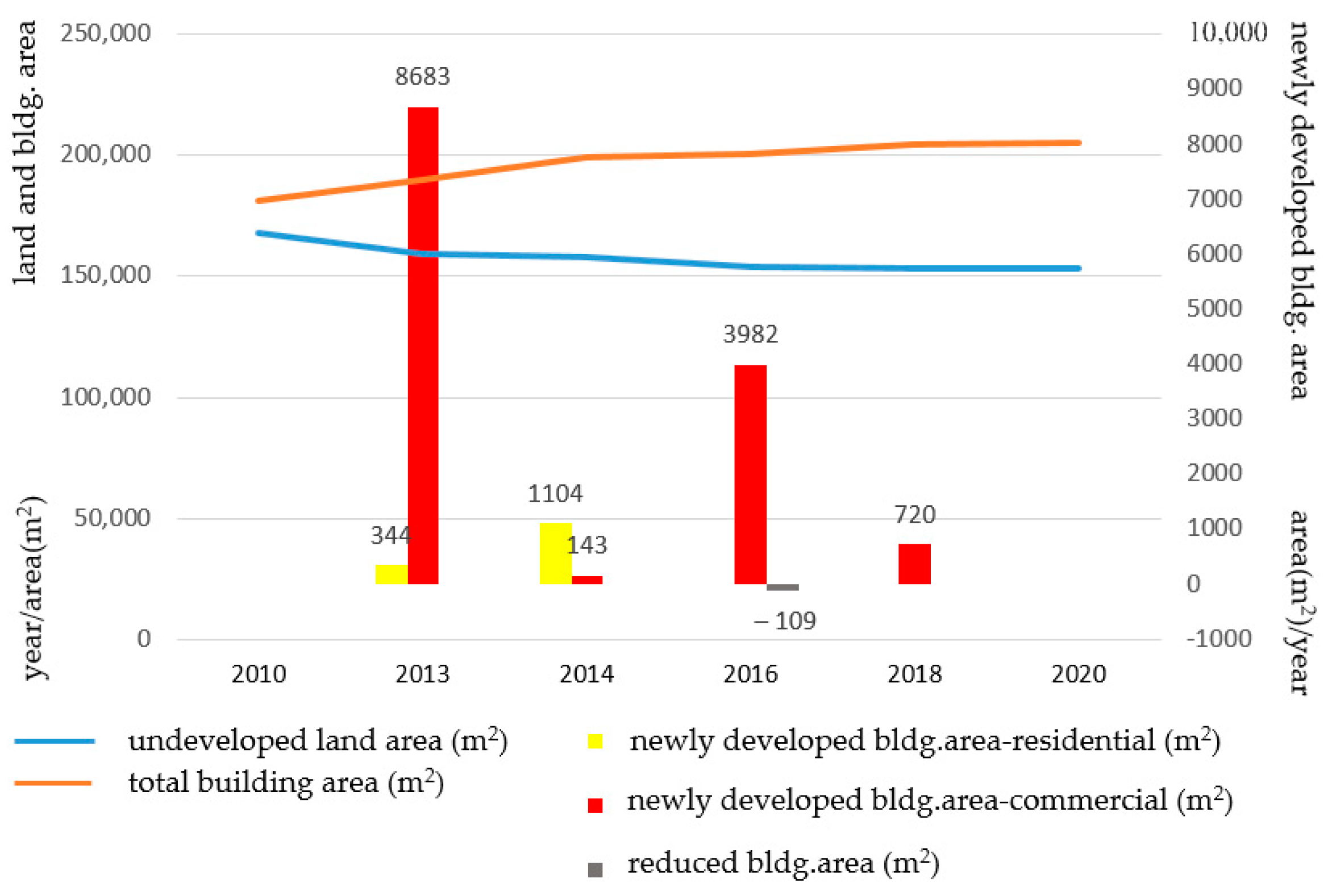 - Google Earth Pro: Historic satellite images were checked to calculate the area of increased buildings, reduced open space, and undeveloped land between 2010 and 2018 (Figure 3top). Images between 2002 and 2009 were missing.