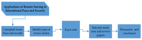 This scoping review is intended to cover an overlaying body of literature on earth observation technology in supporting emerging issues like sustainable development, human development, international peace, and security [33,34,35]. It presents a brief description of each application of remote sensing to these developmental and security issues at a global perspective [33,34,35]. Potentially relevant reference materials were obtained from research databases and appraised according to whether they included information on the previously mentioned themes. Thus, this review provides a broad introductory understanding structured across three nodes. First is the concept of peace and security. Second, the relevance of remote sensing to the issues of peace and security is introduced. Third, the contemporary status, challenges, and opportunities for peace and security through remote sensing are discussed. Figure 2 illustrates the flow of literature review for this study.