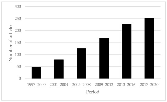 The keywords identified were “role of remote sensing in international peace and security,” “international peace and security with remote sensing,” “geopolitics and remote sensing,” “international conflicts resolution with remote sensing,” and “remote sensing-based conflict resolution” were also chosen as search terms to gather more articles related to this study. To know the trend, the search was carried out using the same keyword for different periods. For example, a keyword phrase of “remote sensing for international peace and security” produced a total of 47, 79, 126, 169, 227, and 252 search results for the period 1997–2000, 2001–2004, 2005–2008, 2009–2012, 2013–2016, and 2017–2020, respectively, while keeping the other search filters the same. Figure 3 shows the trend in searched papers. The rising numbers of published studies indicates the growing role of remote-sensing approaches toward international peace and security.