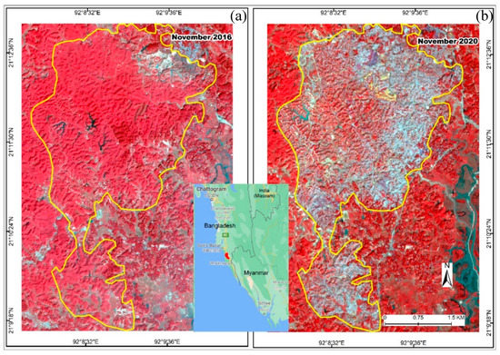 Images acquired from high-resolution satellite data can help in monitoring environmental degradation due to the movement of displaced persons from the conflict area. For instance, PlanetScope data shows an increase in the built-up area near the Kutupalong refugee camp in Cox’s Bazar, Bangladesh. Figure 5a,b show the PlanetScope images acquired on 25 November 2016 and 15 November 2020, respectively. The development of the 32 Km2 of Rohingya refugee camps destroyed also harmed biodiversity. These images acquired before and after the incident provide clear evidence of forest disturbance due to the development of the refugee campsite (Figure 5a,b). Satellite data can be useful to provide information about environmental degradation due to international conflicts [47]. Knowing the size of refugee camps can help international agencies to plan and manage relief operations by providing logistic support, financial aids, and medical supports for these camps.