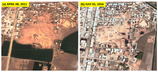 Figure 9 shows another case study in the conflict zones of Syria, where an archaeological site was damaged during the Syrian civil war. Figure 9a,b show the encroachment around the Abbasid Palace and its peripheral area using satellite data before (8 April 2011) and after (1 July 2016) the conflict, respectively. The former Abbasid Palace compound, Syria, which was one of the archaeological sites, is now covered by a modern building visible in satellite data [60]. The temporal satellite data shows the change in the built-up area due to the Islamic State of Iraq and Syria (ISIS) activities. On the city scale, the high-resolution satellite data have been used for mapping ambient light during the night in urban environments for security [61].