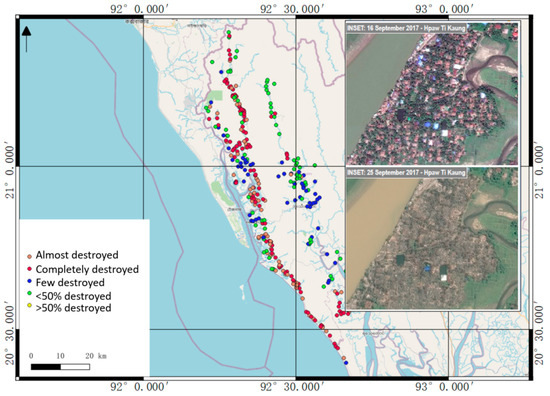 Areas of satellite-detected destroyed or otherwise damaged settlements in Northern Rakhine State in Myanmar. Inset figures showing destroyed villages (Source: UNITAR/UNOSAT).